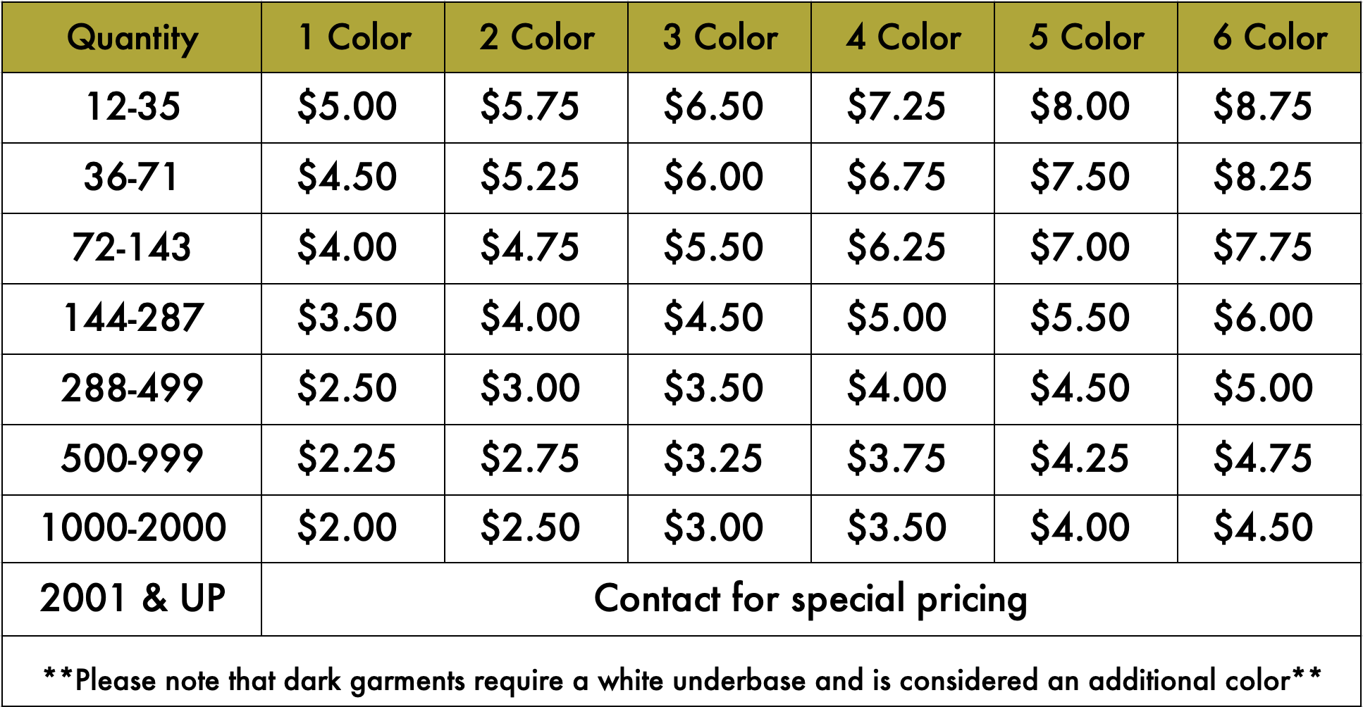 **Please note that dark garments may require a white under base and is considered an additional color.